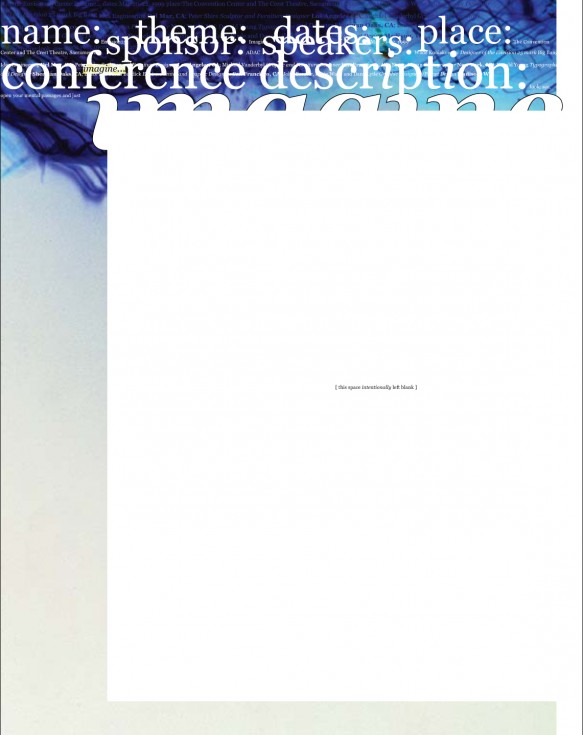 Project: A poster designed for a designers conference. It was engineered to visually attract designers while providing information on the conference theme “Imagine”. The highlight of the poster is the large blank white area with the words “this space intentionally left blank” written, encouraging viewers to dream!